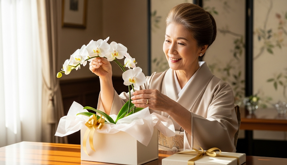 「この胡蝶蘭には『幸福が飛んでくる』という花言葉があるのよ。二人にたくさんの幸せが訪れるように願って選んだの」と伝えれば、ただの美しい花が、家族の幸せを願う特別なシンボルに変わります。