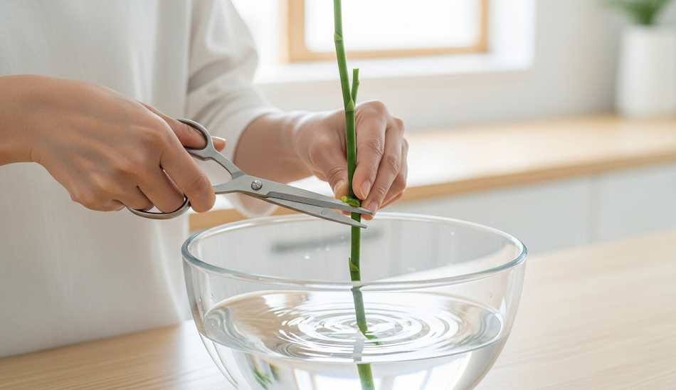 茎の長さと花瓶の高さのバランスは、茎が花瓶の1.5倍から2倍程度の長さになると、美しく見えます。