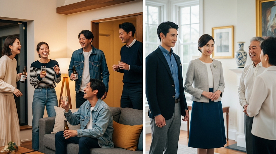 ジャージやスウェット、ダメージジーンズなどは、親しい友人宅であっても避けるべきです。