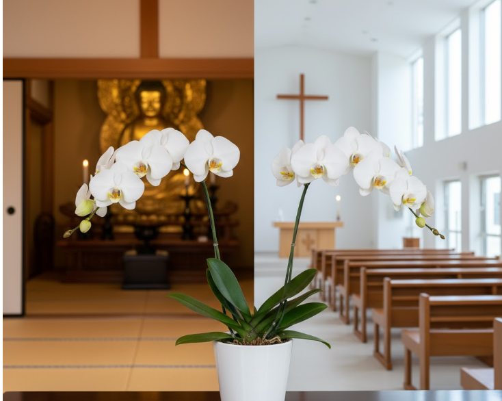 そのため、教会での葬儀の際には祭壇に供花を飾る習慣がなく、スタンド花や大きな鉢植えの胡蝶蘭は受け付けていない場合があります。
